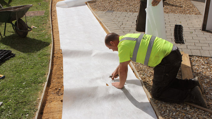 Fitted membrane around French drains to prevent stone contamination. Water now drains correctly and product matched description.